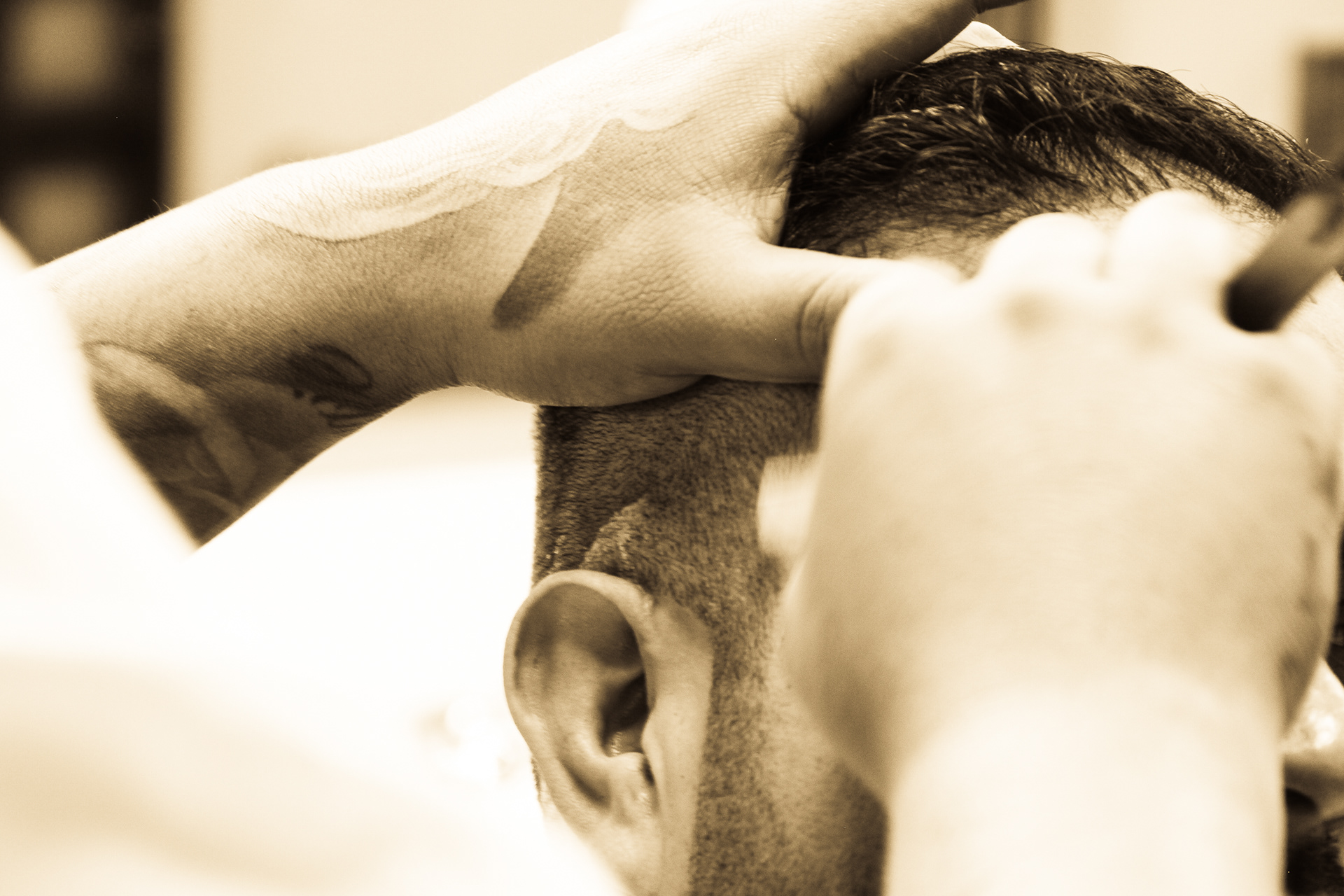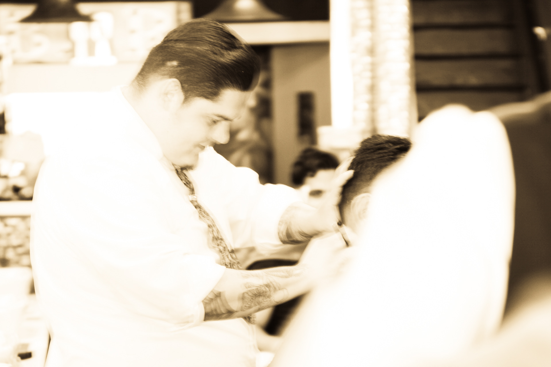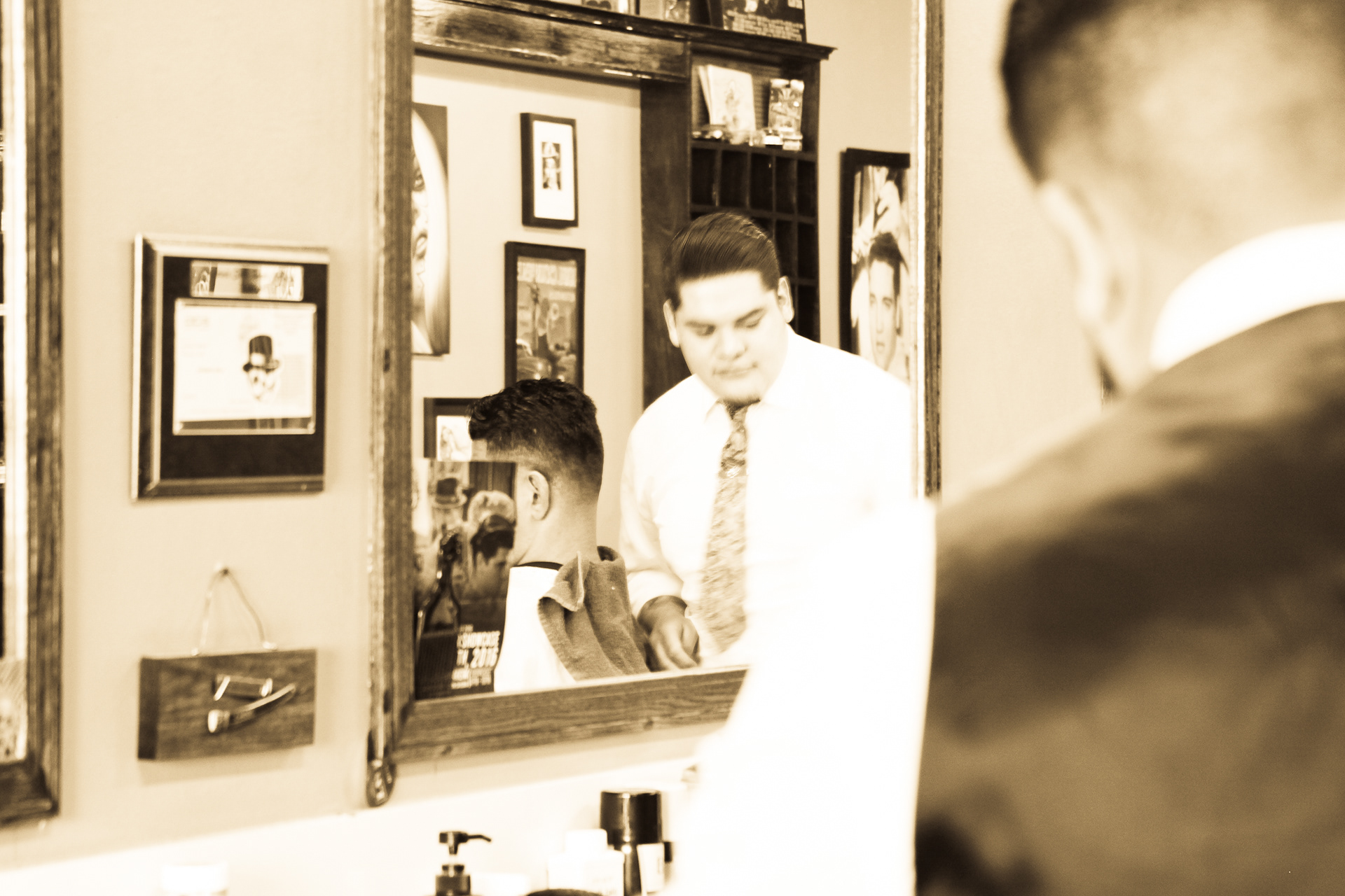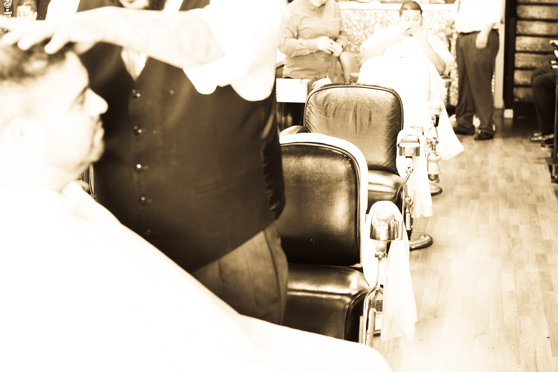 Using sepia filter to create a vintage look and a shallow depth of field to focus the attention on specific details helps to impart an intimate yet timeless feeling. From the waiting area to the barber chair, great attention was paid to the POV of the photography ensuring that the customer's view of the experience is being captured.