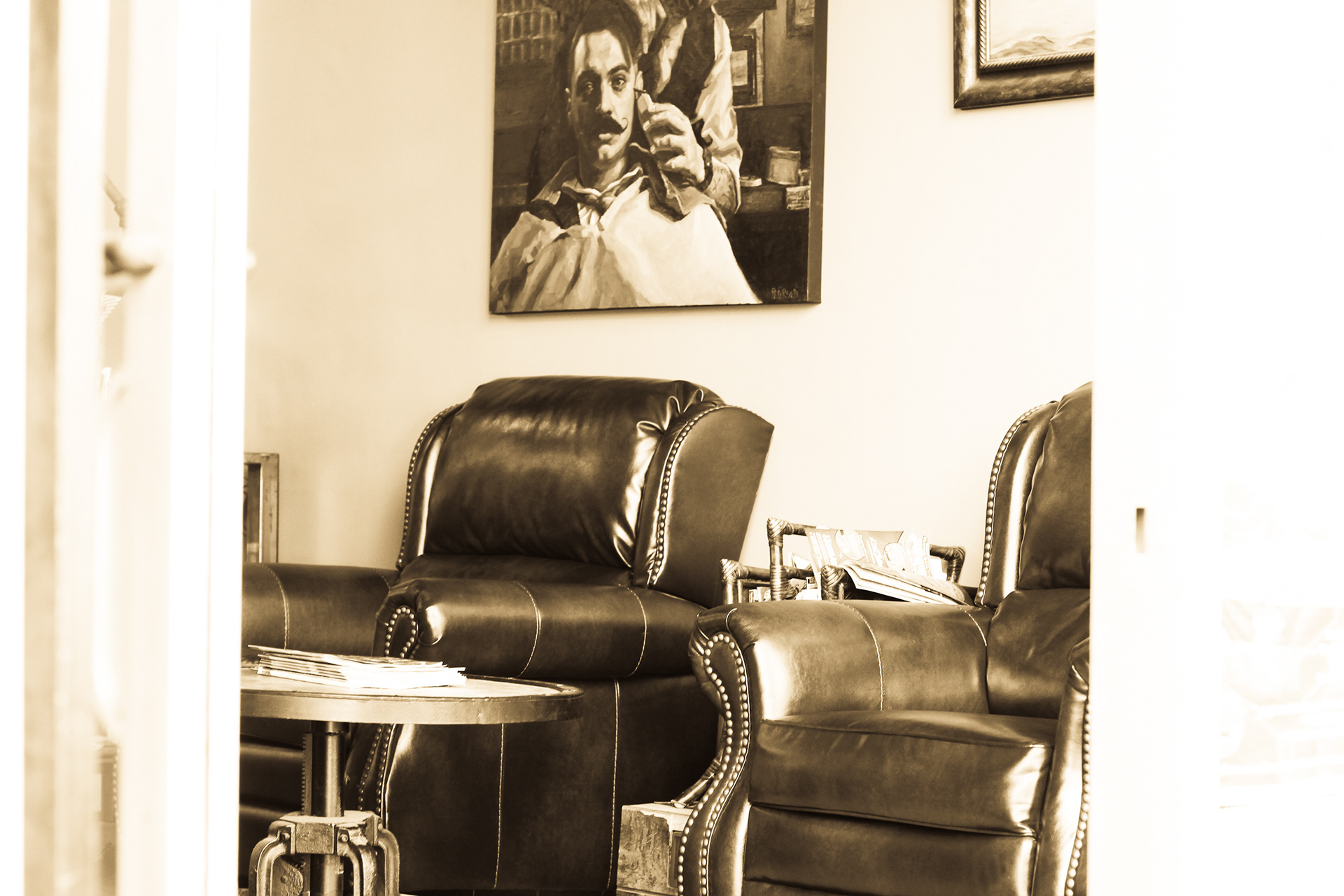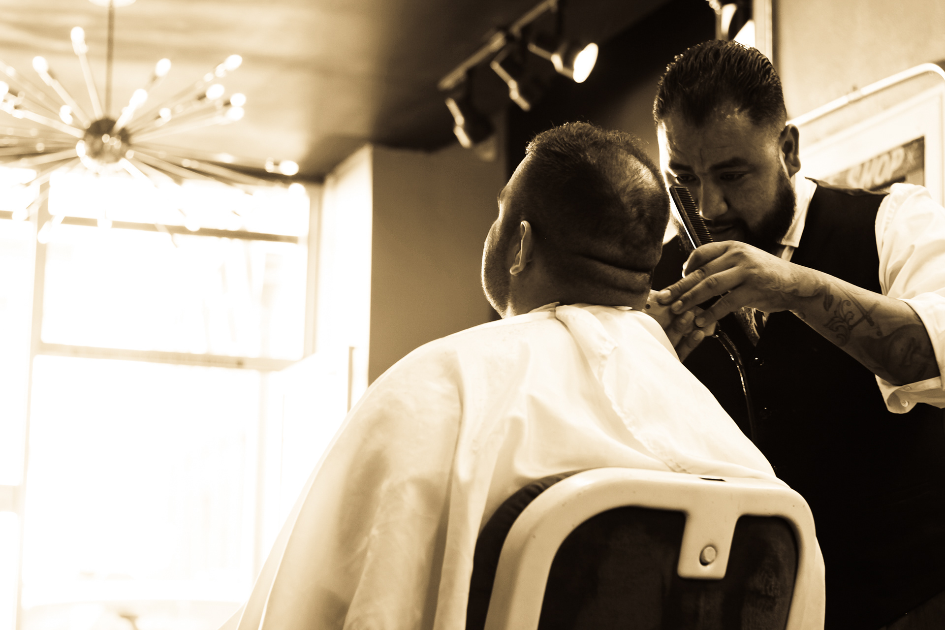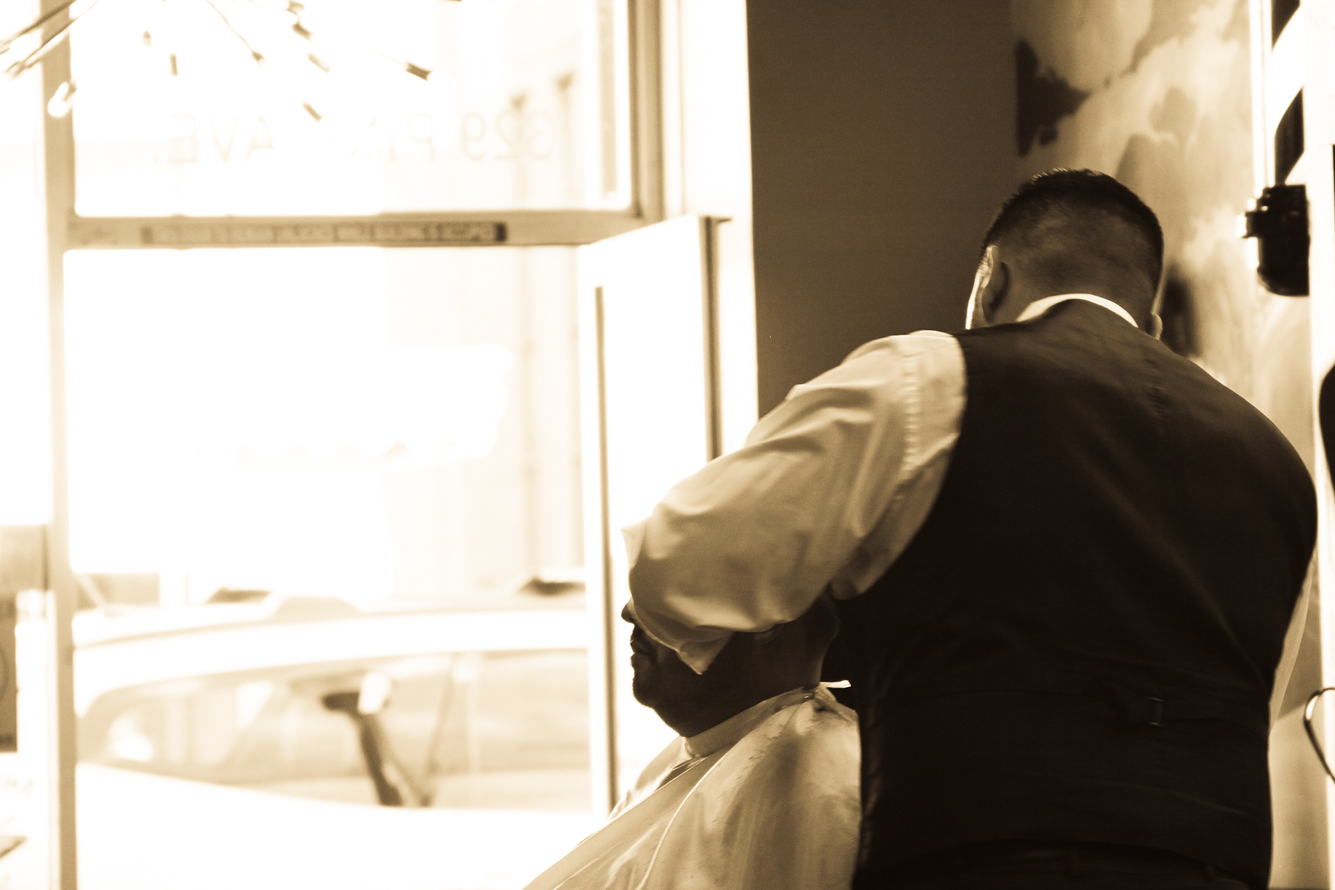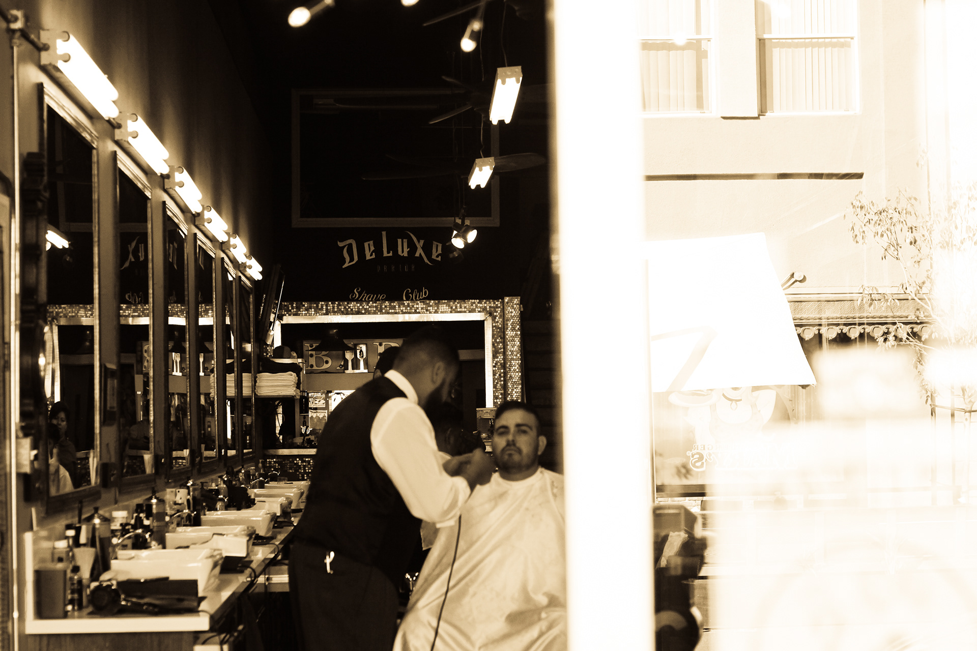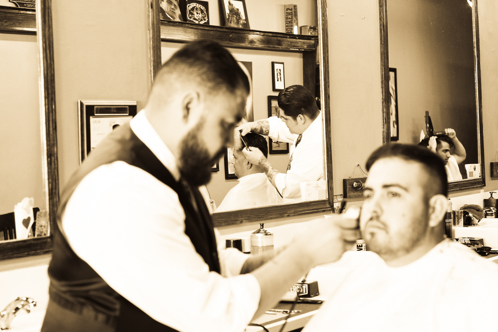 Using sepia filter to create a vintage look and a shallow depth of field to focus the attention on specific details helps to impart an intimate yet timeless feeling. From the waiting area to the barber chair, great attention was paid to the POV of the photography ensuring that the customer's view of the experience is being captured.