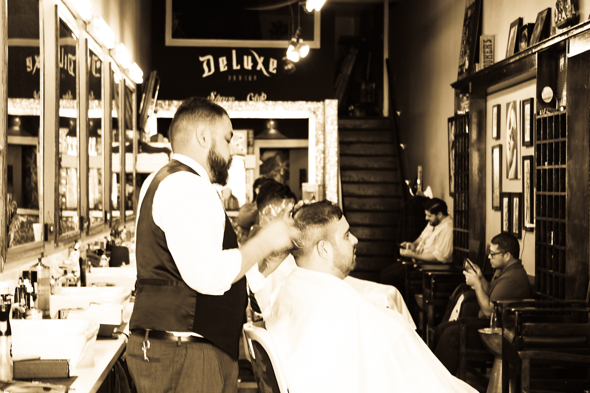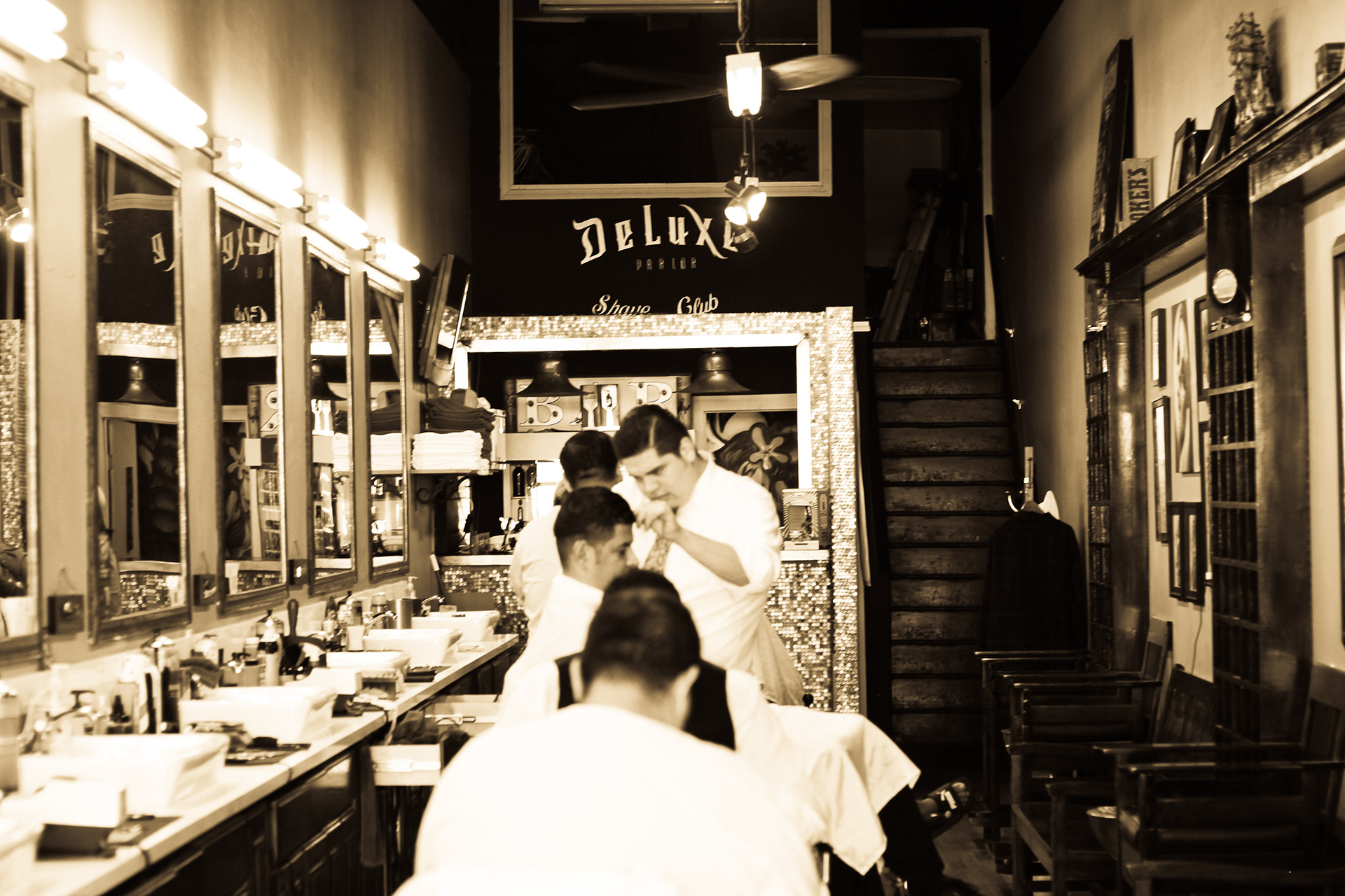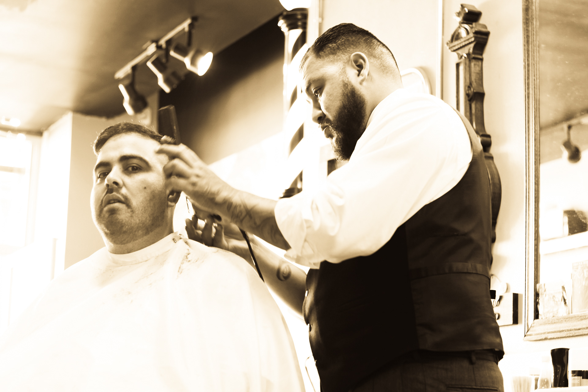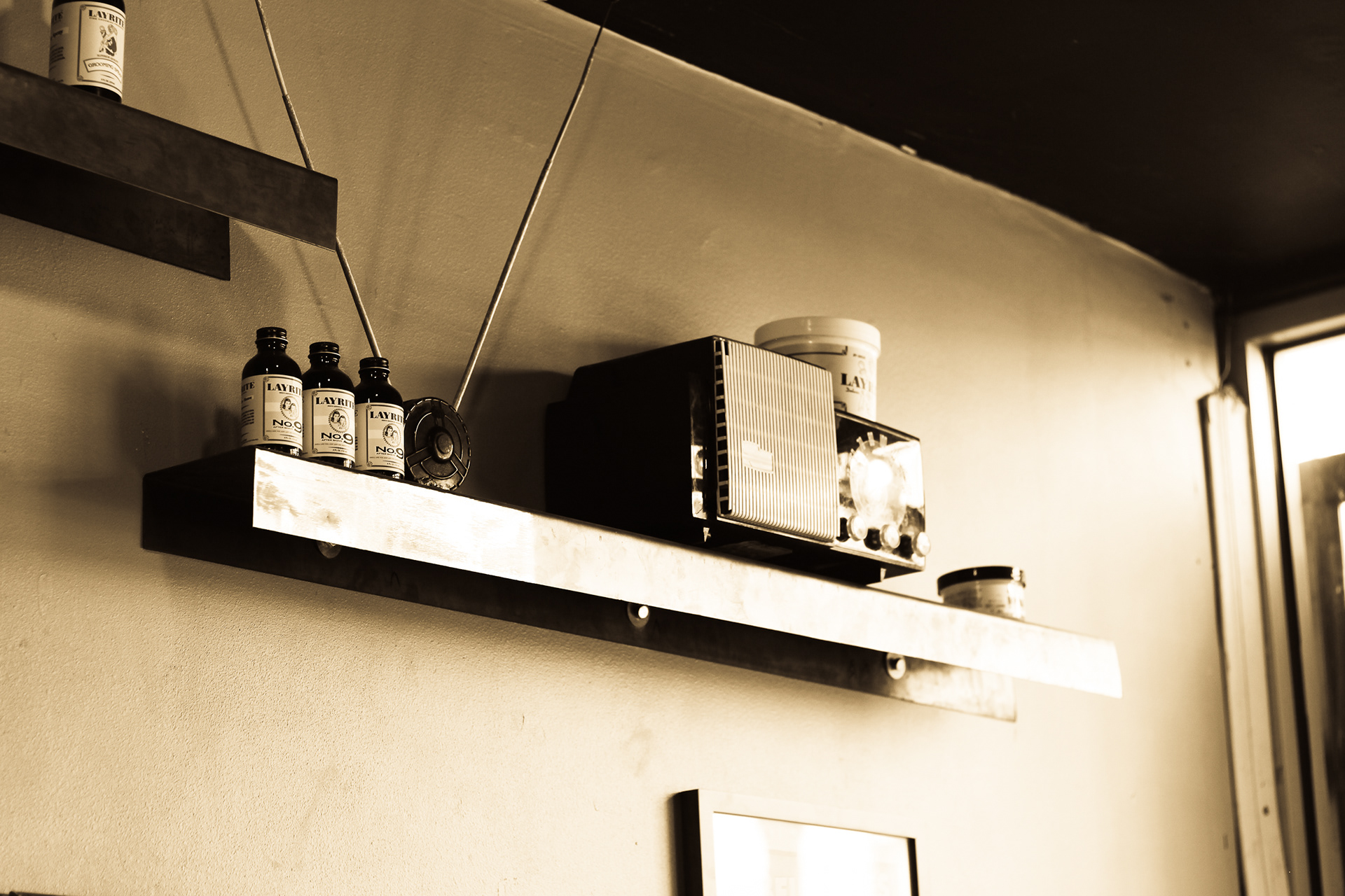 Using sepia filter to create a vintage look and a shallow depth of field to focus the attention on specific details helps to impart an intimate yet timeless feeling. From the waiting area to the barber chair, great attention was paid to the POV of the photography ensuring that the customer's view of the experience is being captured.