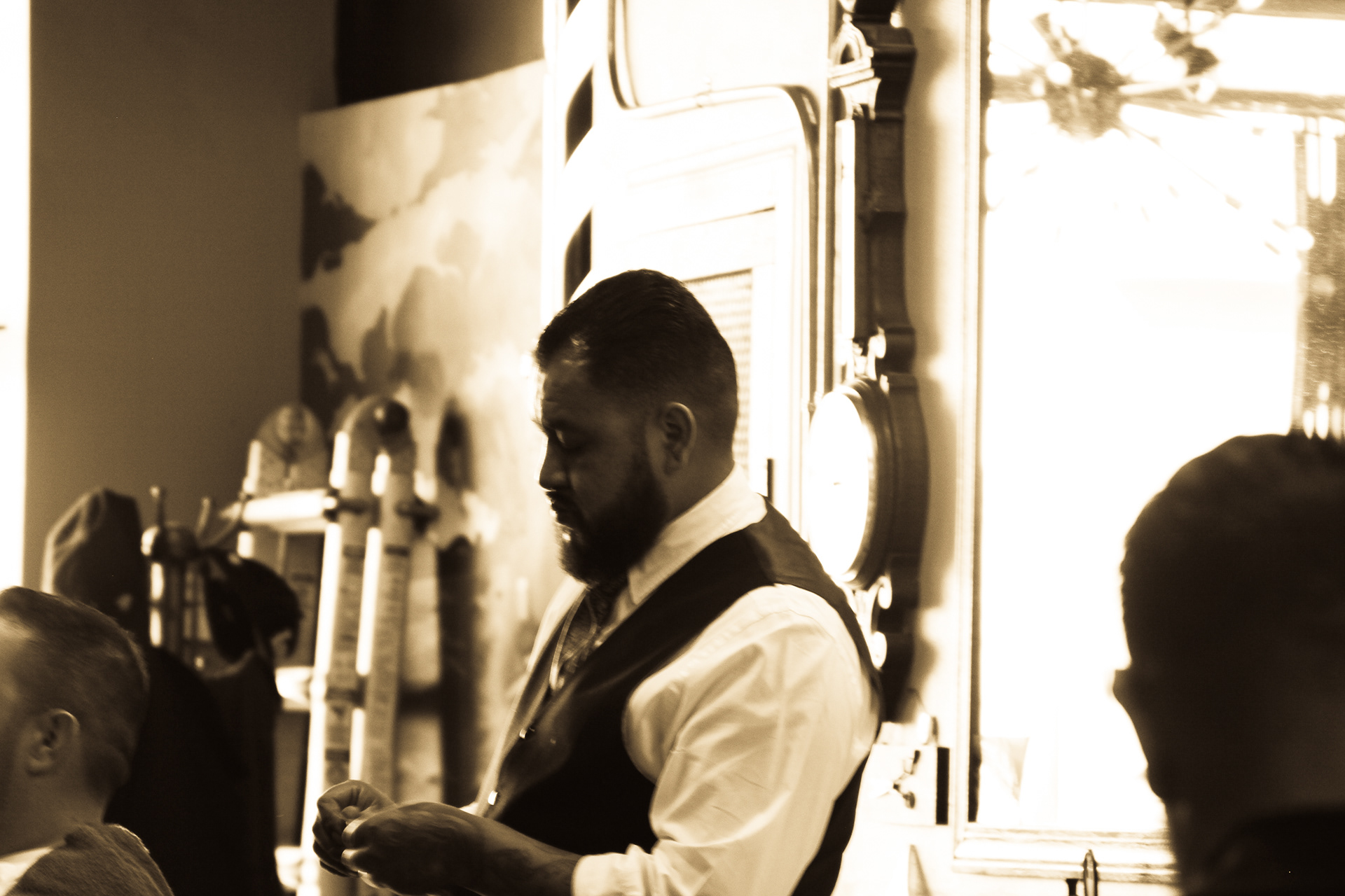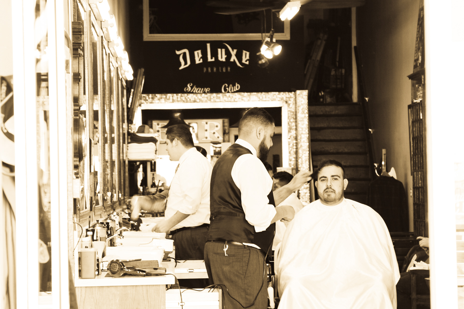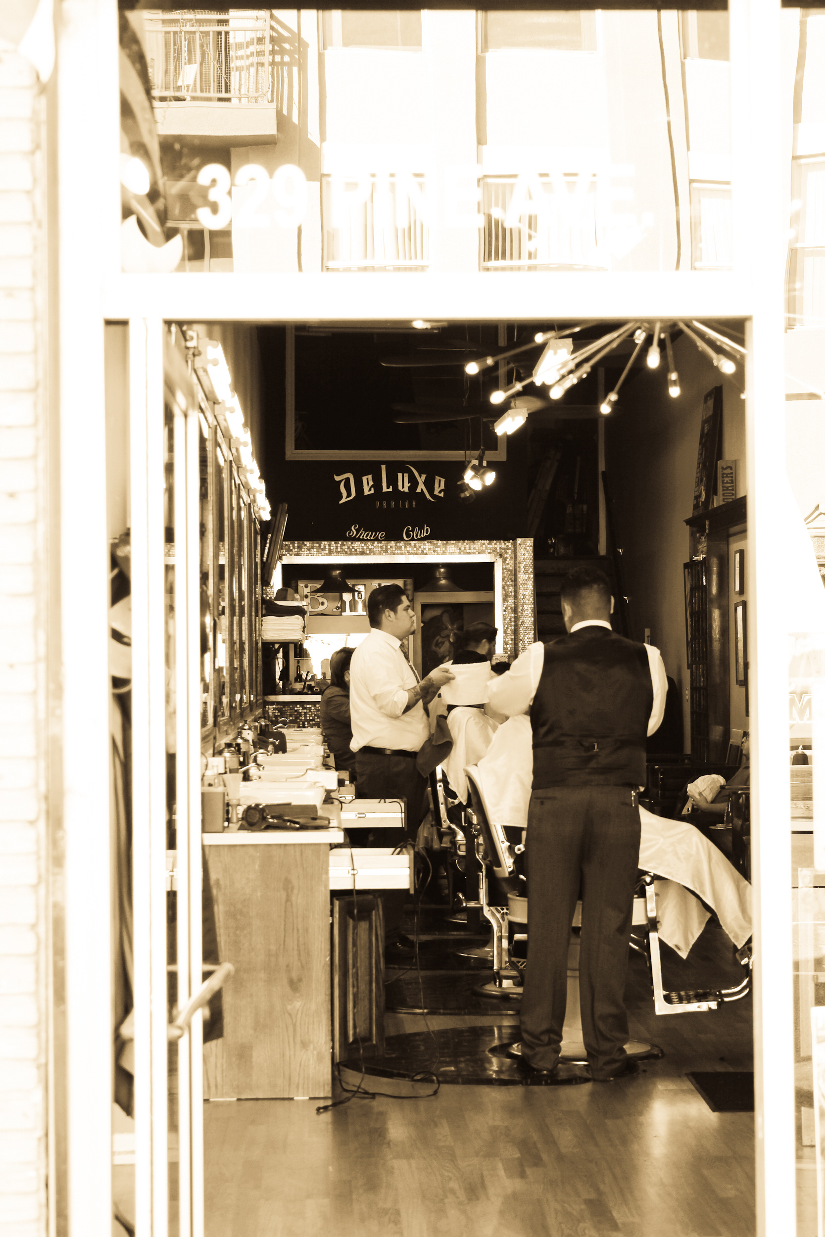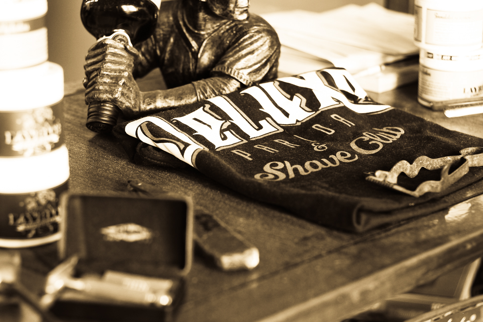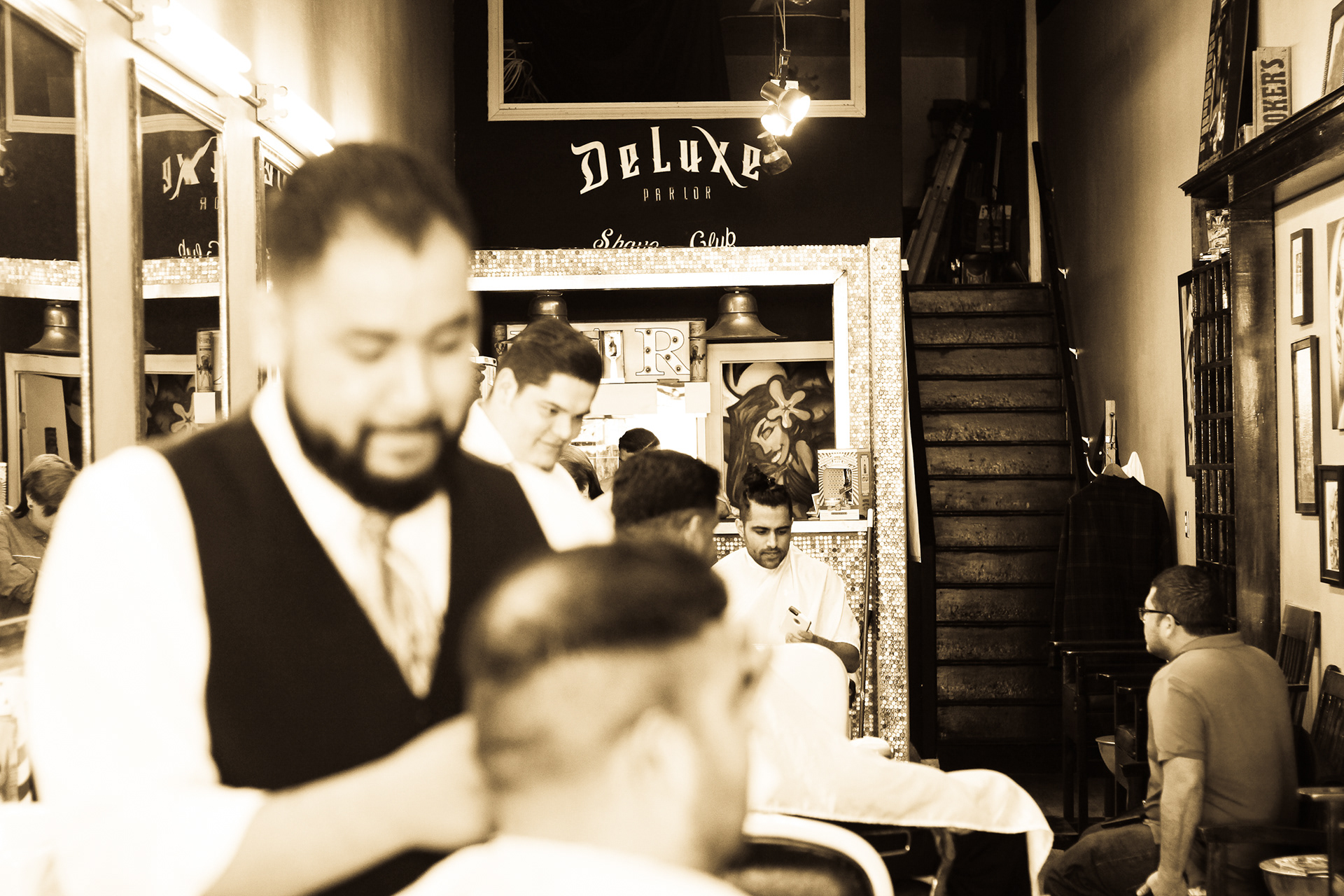 Using sepia filter to create a vintage look and a shallow depth of field to focus the attention on specific details helps to impart an intimate yet timeless feeling. From the waiting area to the barber chair, great attention was paid to the POV of the photography ensuring that the customer's view of the experience is being captured.